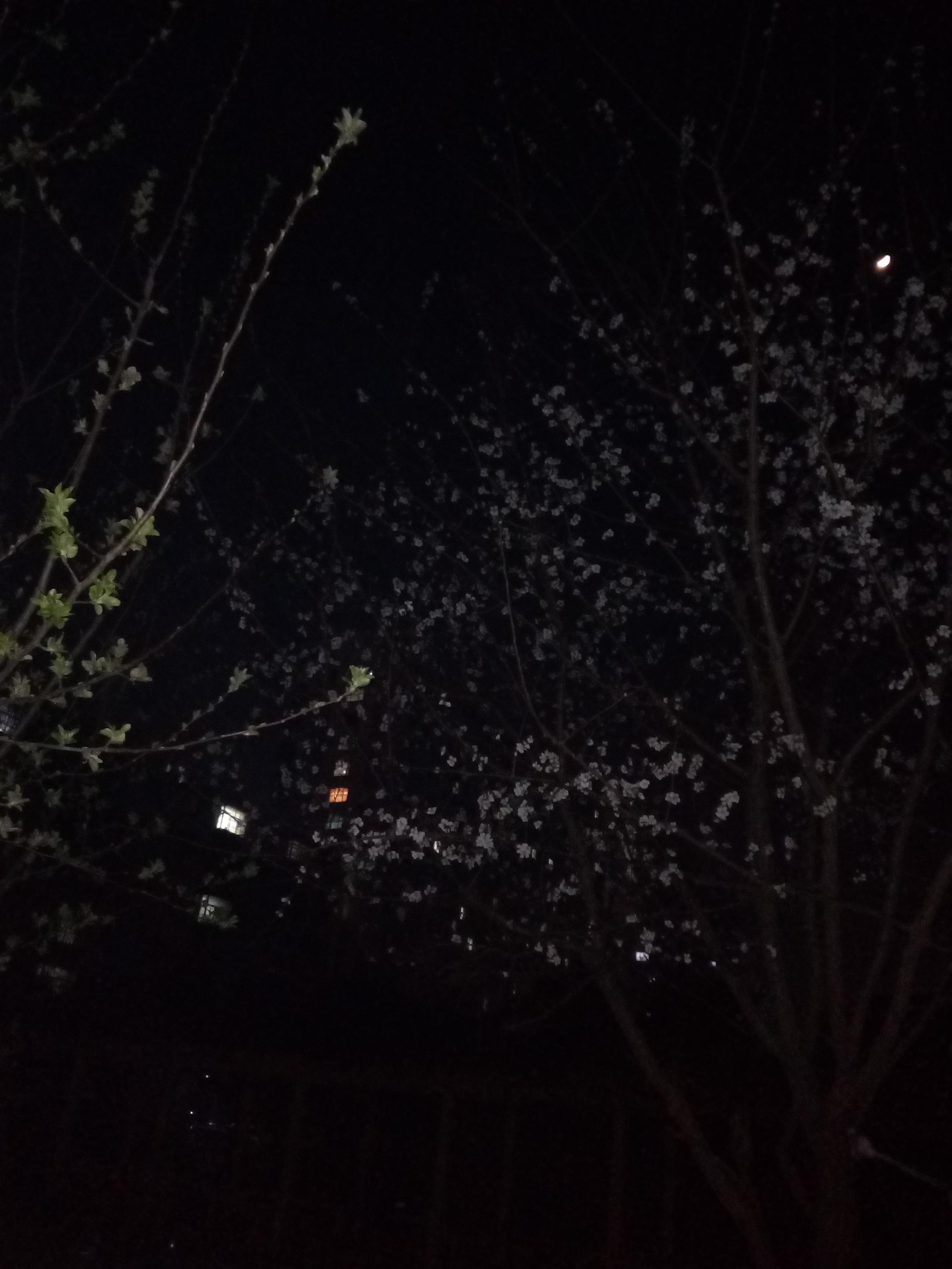 注:散步于楼前花园小径,灯光恰照眼前头上花满几树,想起白天窗外鸟鸣悦人,正怡然悦赏,忽更见花枝间一轮明月,顿诗兴油然而生,得此诗。